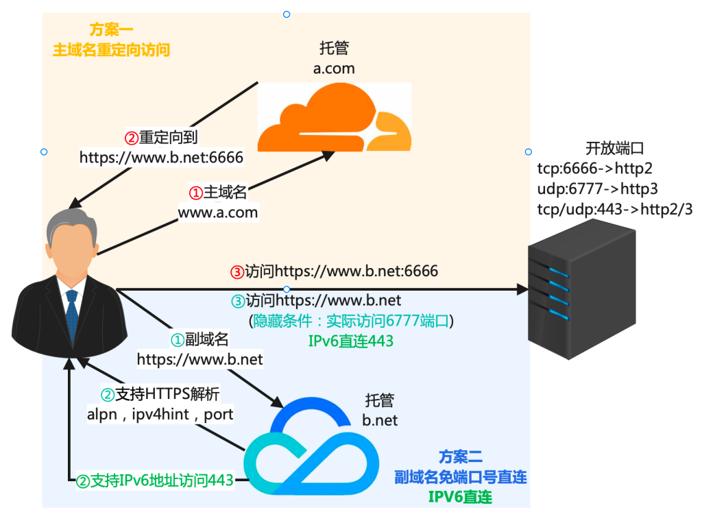 至于为什么需要两个域名是因为HTTPS/SVCB解析如果在默认访问端口上存在服务的话会直接访问该服务而不进行跳转。因此使用HTTPS/SVCB解析需要将默认访问端口443空出来。不过刚好我们的副域名b.net的443端口是没有服务的
