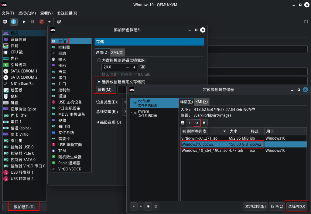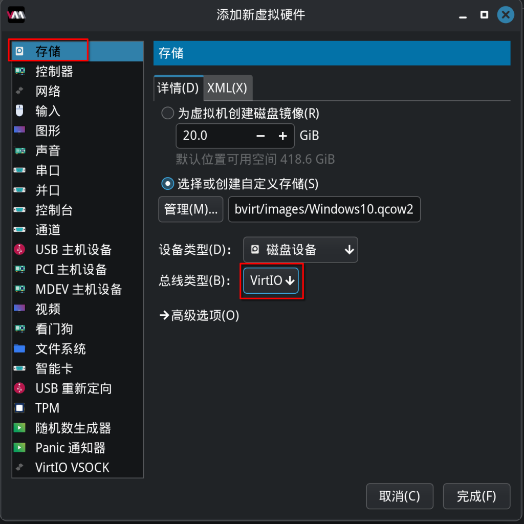 接下来我们使用命令行来创建一个压缩镜像,这样创建的进行大小会随着存储变化而变化,默认使用virt-manager创建的大小是实际大小,不利于移动和分享,最后刷新后创建使用新创建的镜像进行添加,总线类型为VirtIO