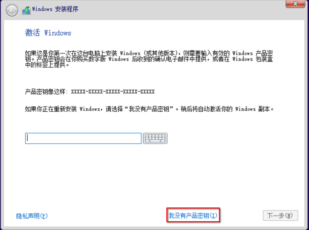 选择我没有产品密钥,激活Windows等到我们进入系统后再激活