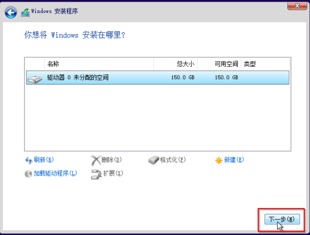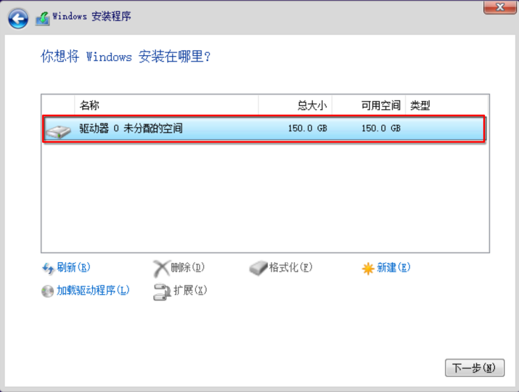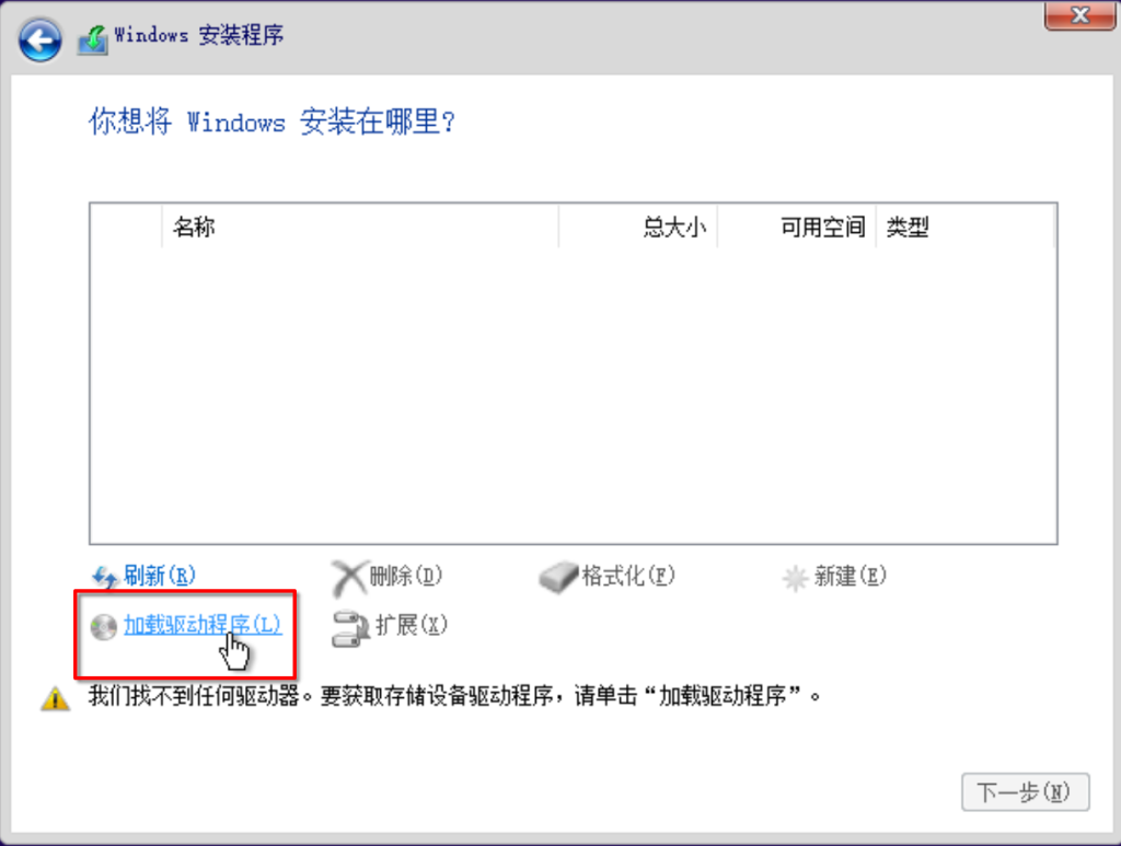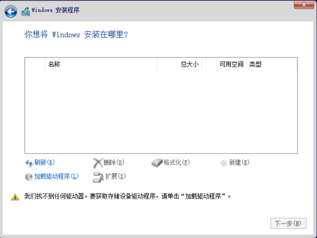 你会发现系统没有识别到任何硬盘,明明我们都已经添加了硬盘了。这是因为我们的硬盘总线类型为VirtIO,因此还需要为Windows添加VirtIO来让其支持