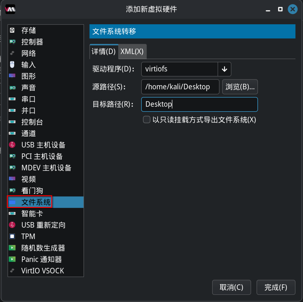 接着关机后在虚拟机添加文件系统,源路径为你linux需要映射到windows内的路径,目标路径为Windows显示的磁盘名字