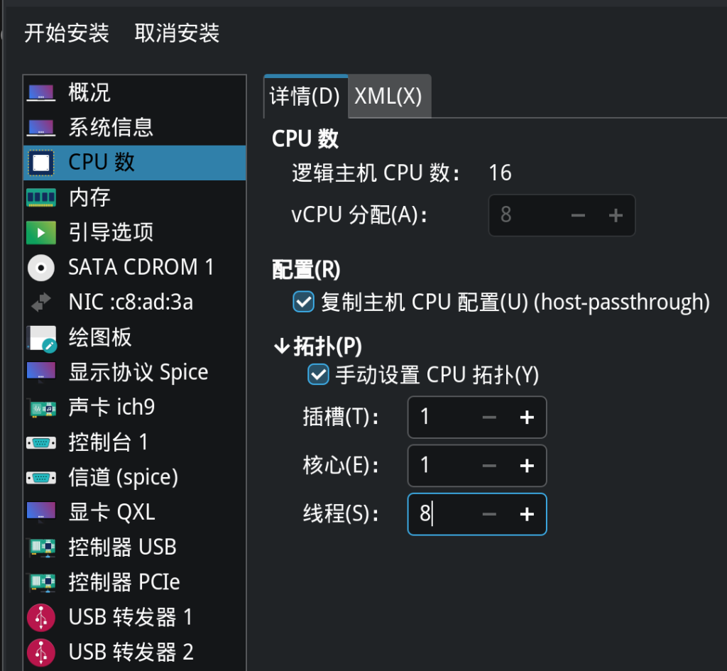 在CPU数量这里可以选择修改CPU拓扑为单核心多线程
