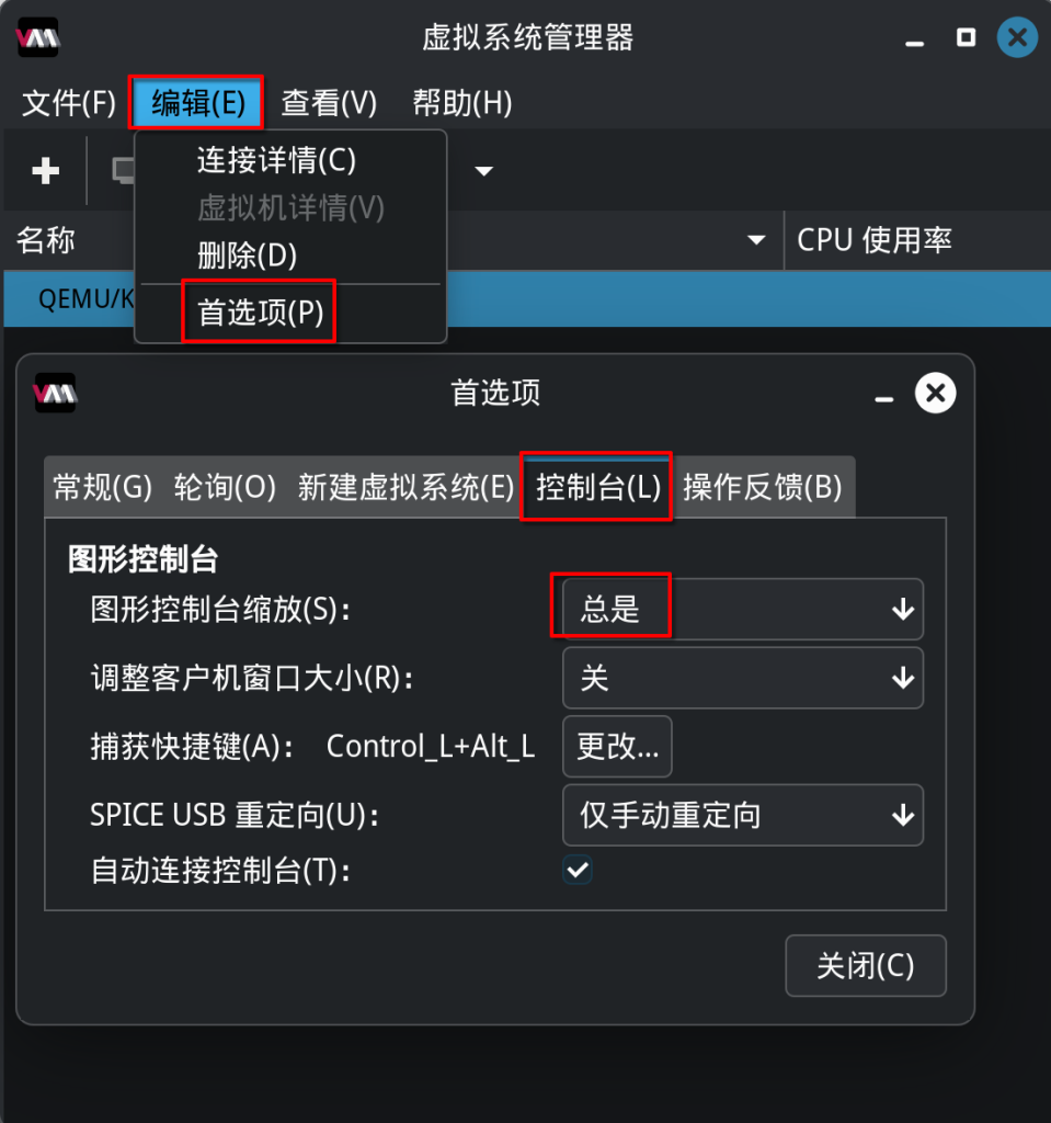 sudo usermod -aG libvirt $(whoami)ShellScript可以首选项那里开启图形控制台缩放