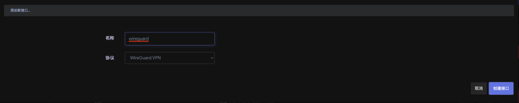在网络->接口,添加新接口来wireguard添加一个接口,名称叫wireguard,协议选择WireGuard VPN
