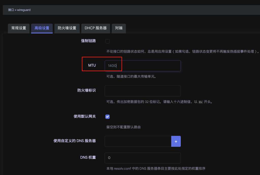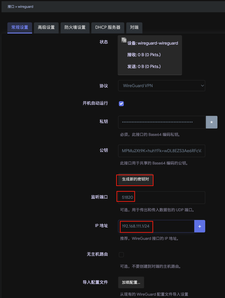 点击生成新的秘钥对,监听端口选择51820,IP地址就选择你的一个和你内网不同网段的ip地址,然后将MTU改为1400或者1380以免单个包太大导致分片,影响效率。保存并退出