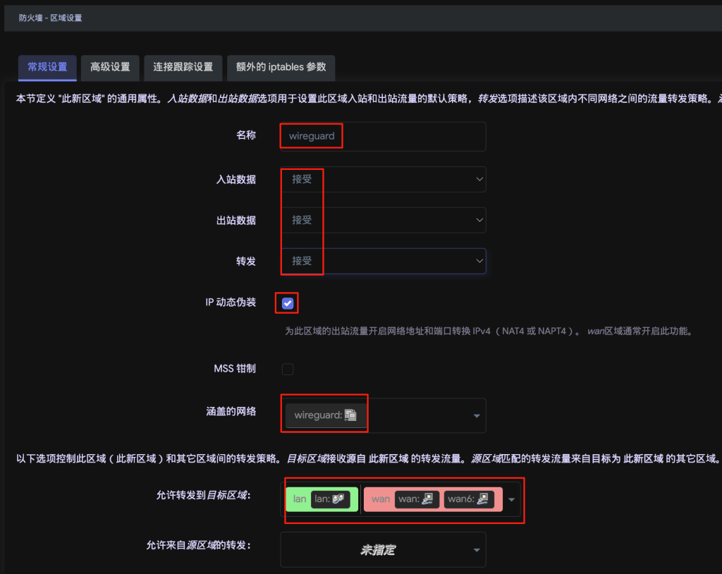 在接口->防火墙->添加来添加一个防火墙区域,名称叫wireguard,全部数据都改为接受,勾选IP动态伪装,涵盖的网络为wireguard,允许转发到lan区域和wan区域。保存并退出