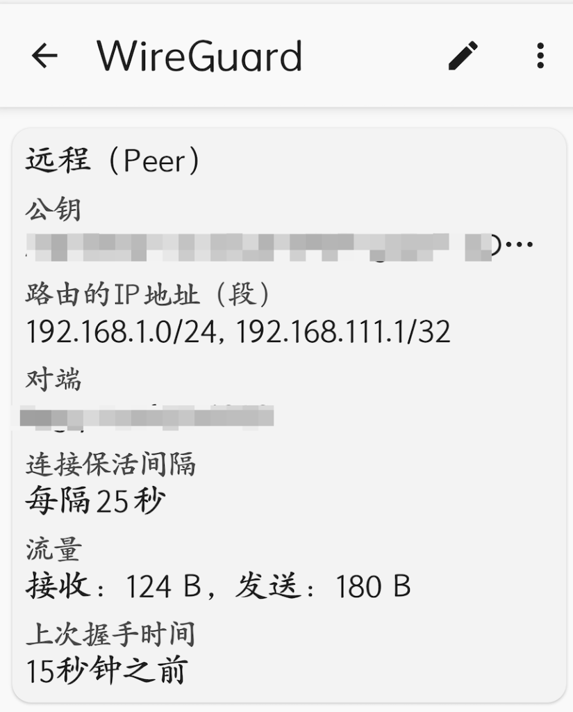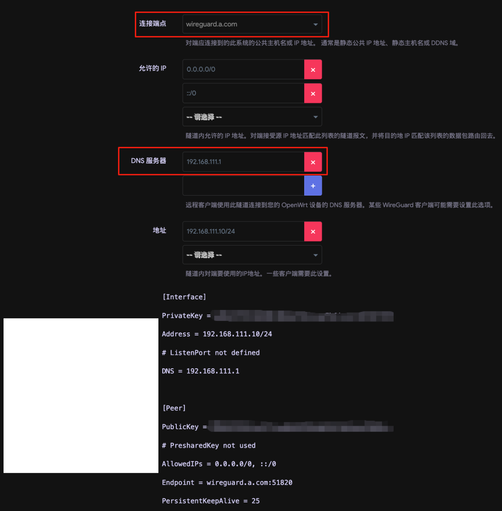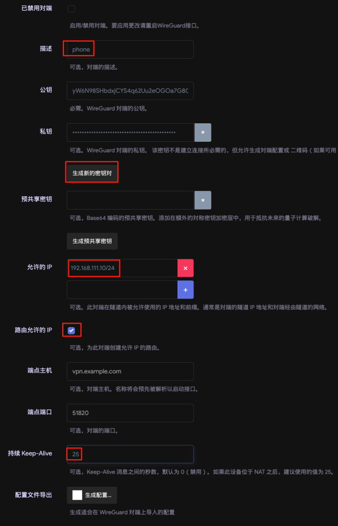 接着以此填入描述、生成新的密钥对、添加一个你的手的VPN的内网ip地址,勾选路由允许的IP,Keep-Alive填25,最后点击生成配置来导出客户端配置