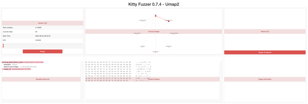 umap2可以支持调用facedancer21进行USB设备模拟和fuzz输入,这个工具大部分操作是支持python3的,但是模糊测试部分的脚本只能使用python2,因此建议只使用python2打开
