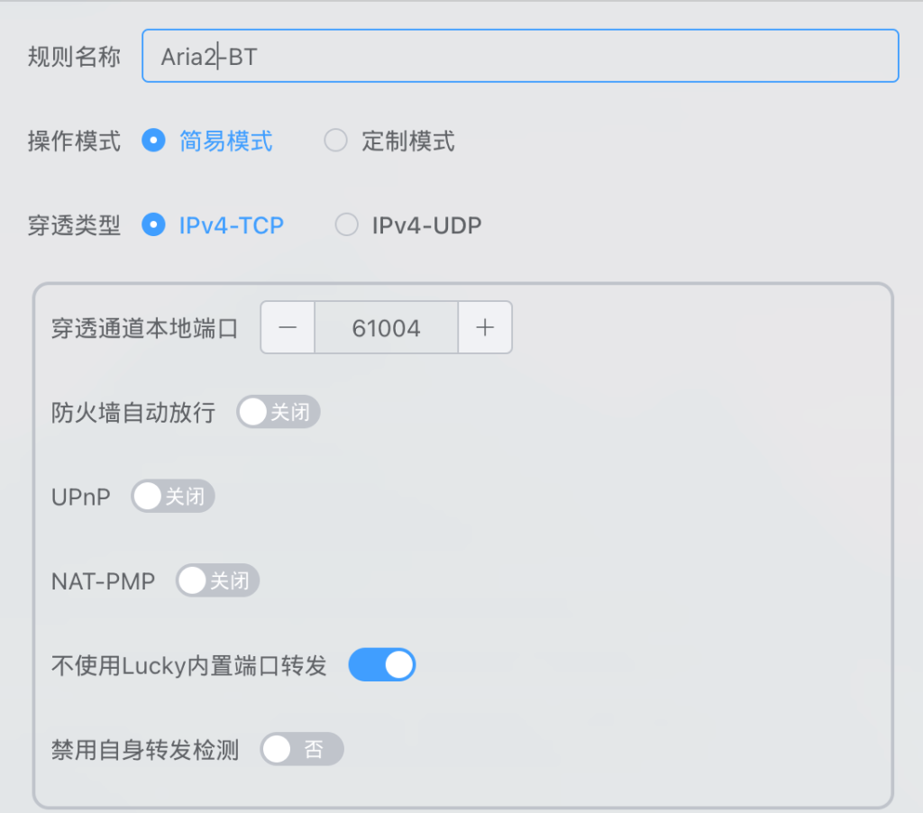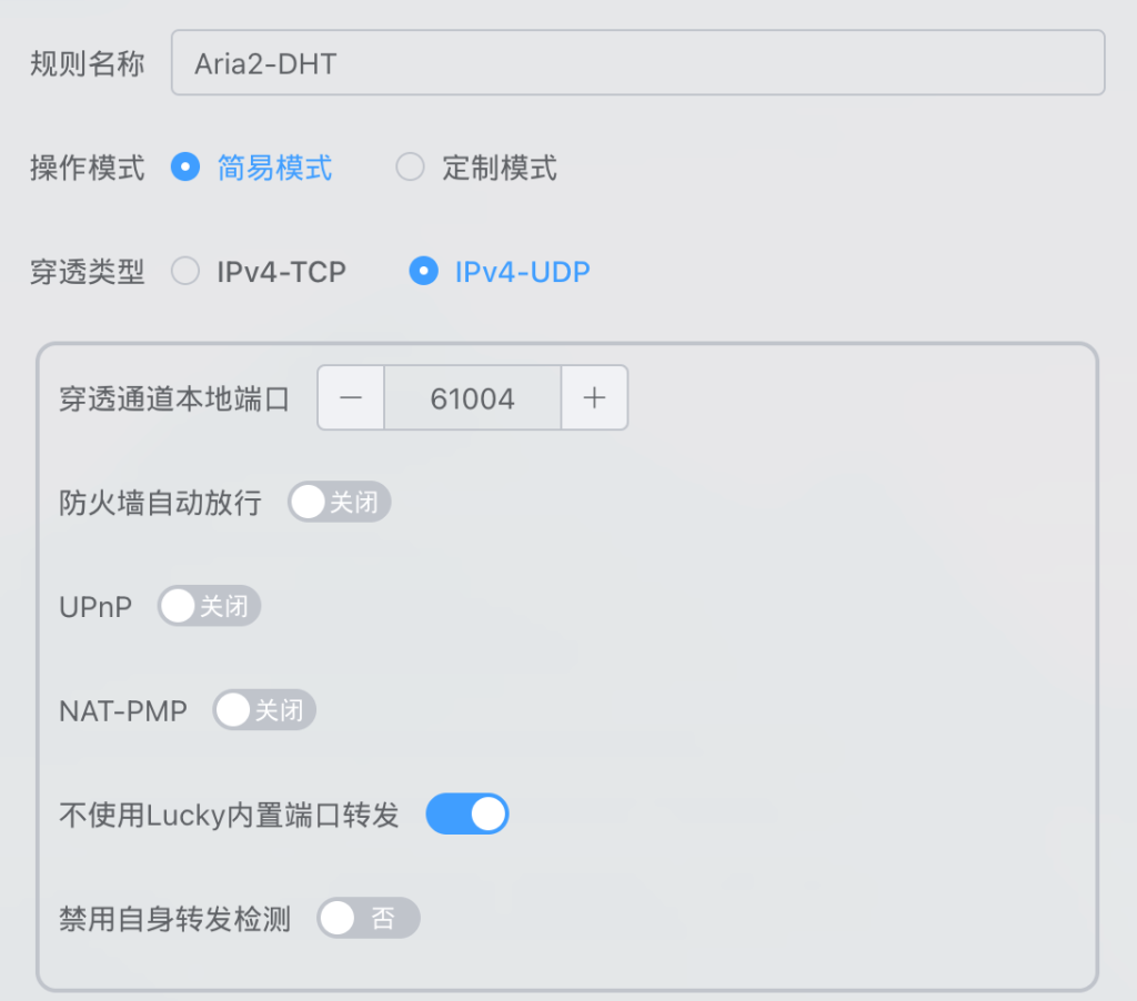 在lucky->STUN->添加穿透规则,分别创建TCP和UDP的STUN穿透规则,端口号可以保持一致。TCP端口用于BT数据传输,UDP端口用于DHT邻居发现。这里不使用内置端口转发,后续配置系统防火墙转发