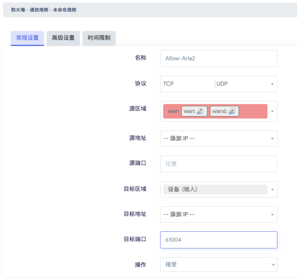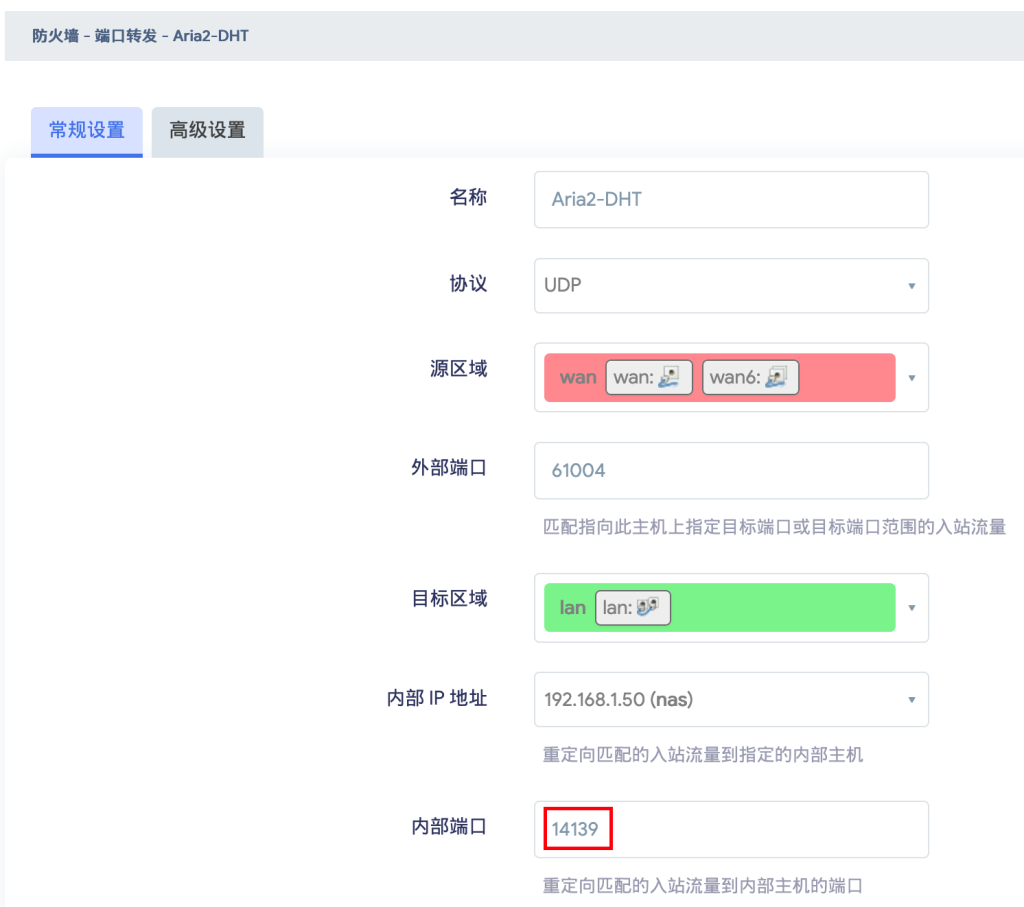 在openwrt->网络->防火墙->端口转发来添加一条端口转发规则,这里的端口转发规则目标地址填写你安装好Aria2的ip地址,内部端口号填写STUN穿透后的公网端口。因为我们要保持aria2的bt监听端口和公网穿透穿透端口保持一致